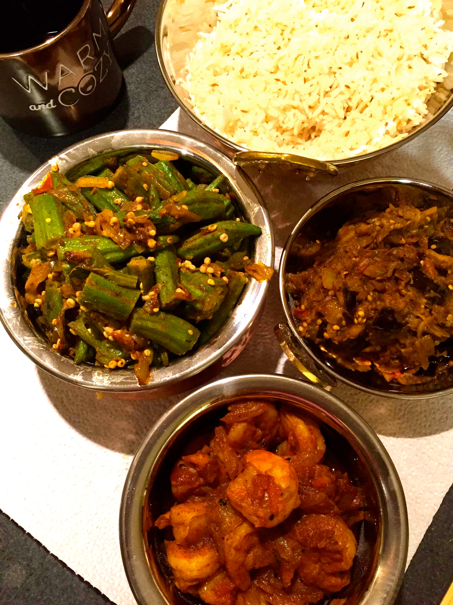 Full spread from tonight’s dinner – bhindi masala, baingan bharta, and sweet & spicy shrimp curry!