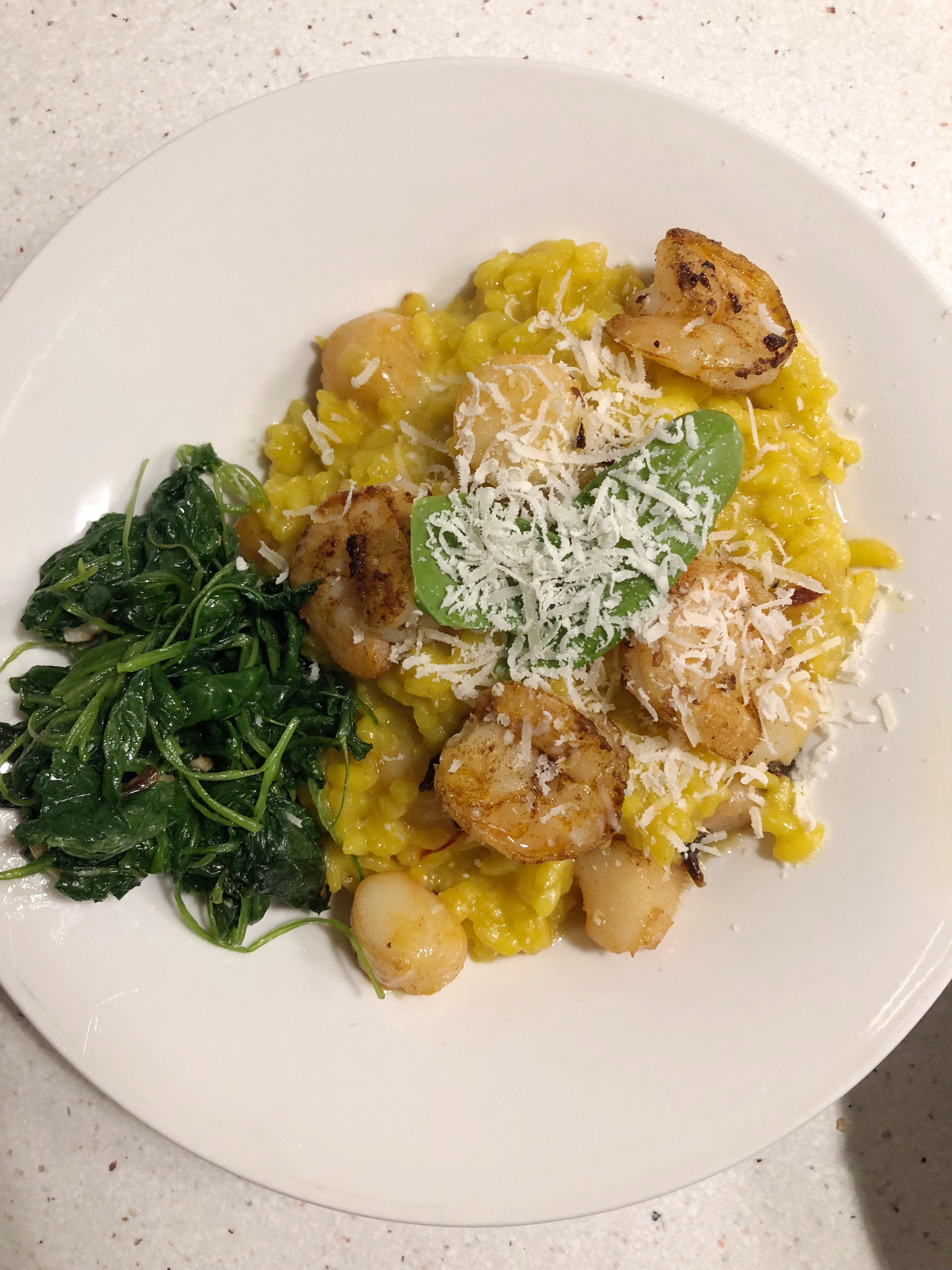 Squid ink pasta has a special place in my heart, and I have a hilarious picture from my bachelorette party years ago to prove it (pro-tip: don’t try squid ink when you’re all dolled up for a night out). It’s not everyone’s cup of tea, but I just love the rich texture and earthy/sea-infused flavor of squid ink pasta. It’s something I always order at restaurants if I see it on the menu, because I imagine it’s incredibly complicated to make at home. Until I walked in my local Trader Joe’s and found Casa Milo’s Squid Ink Spaghetti on the “new products” shelves, that is. I immediately snagged it and decided to pair it with shrimp and a creamy, garlicky, tomato basil saffron sauce. Sooo delicious and luxurious. The spaghetti was simple to prepare (just followed the directions and boiled for ten minutes till al dente) and had a lovely, subtle flavor to it. Not super overpowering, and perfect for squid ink virgins. RUN, don’t walk to your nearest Trader Joe’s to give this a try! Immediately ups the ante of any pasta dish and makes it tres gourmet 🙂 Perfect for hosting, date night, or just a regular weekend meal if you’re feeling fabulous.